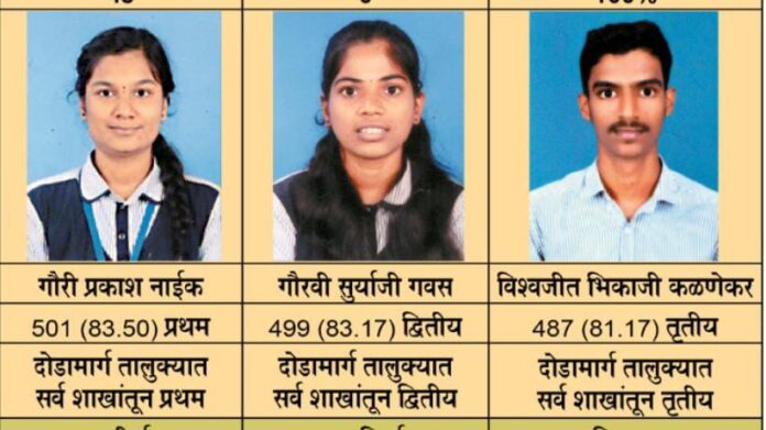दोडामार्ग : उच्च माध्यमिक शालांत प्रमाणपत्र परीक्षा मार्च 2025 चा निकाल नुकताच जाहीर करण्यात आला असून दोडामार्ग तालुक्यातील सर्व प्रविष्ठ विद्यार्थी उत्तीर्ण झाल्याने 100% टक्के निकाल लागला आहे यात तालुक्यात इंग्लिश स्कूल दोडामार्गचा कुमारी गौरी प्रकाश नाईक 501 गुण(83.50%) मिळवून प्रथम तर द्वितीय गौरवी सूर्याजी गवस 499गुण(83.17) तर तृतीय क्रमांक विश्वजित भिकाजी कळणेकर 487(81.17) सर्व विद्यार्थी दोडामार्ग इग्लिश स्कूल व ज्युनिअर कॉलेज दोडामार्ग चे आहेत यशस्वी सर्व स्तरांतून अभिनंदन करण्यात येत आहे