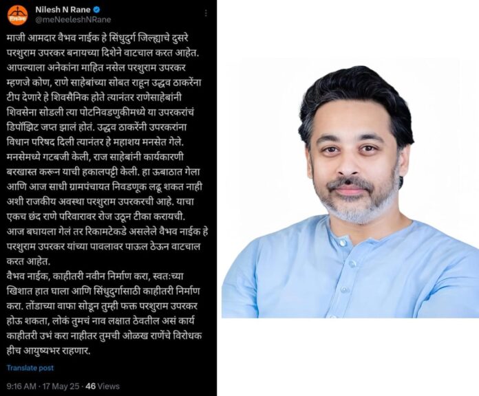पुढे त्यांनी केलेल्या पोस्ट मध्ये असे म्हटले आहे की, आपल्या अनेकांना माहित नसेल परशुराम उपरकर म्हणजे कोण, राणे साहेबांच्या सोबत राहून उद्धव ठाकरेंना टीप देणारे हे शिवसैनिक होते. त्यानंतर राणेसाहेबांनी शिवसेना सोडली त्या पोटनिवडणुकीमध्ये या उपरकरांचं डिपॉझिट जप्त झालं होतं. उद्धव ठाकरेंनी उपरकरांना विधान परिषद दिली त्यानंतर हे महाशय मनसेत गेले. मनसेमध्ये गटबजी केली, राज साहेबांनी कार्यकारणी बरखास्त करून याची हकालपट्टी केली. हा ऊबाठात गेला आणि आज साधी ग्रामपंचायत निवडणूक लढू शकत नाही अशी राजकीय अवस्था परशुराम उपरकरची आहे. याचा एकच छंद राणे परिवारावर रोज उठून टीका करायची. आज बघायला गेलं तर रिकामटेकडे असलेले वैभव नाईक हे परशुराम उपरकर यांच्या पावलावर पाऊल ठेऊन वाटचाल करत आहेत. वैभव नाईक, काहीतरी नवीन निर्माण करा, स्वतःच्या खिशात हात घाला आणि सिंधुदुर्गासाठी काहीतरी निर्माण करा. तोंडाच्या वाफा सोडून तुम्ही फक्त परशुराम उपरकर होऊ शकता, लोकं तुमचं नाव लक्षात ठेवतील असं कार्य काहीतरी उभं करा नाहीतर तुमची ओळख राणेंचे विरोधक हीच आयुष्यभर राहणार. अशी टिका कुडाळ मालवण मतदारसंघघाचे आमदार निलेशजी नारायणराव राणे यांनी केली आहे.