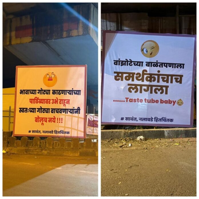कणकवली शहरात फ्लाय ओव्हर ब्रिज खाली दोन ठिकाणी नलावडे – सावंत हितचिंतकांकडून हे बॅनर लागले असून कणकवलीत श्रीधर नाईक चौक व छत्रपती शिवाजी महाराज चौक या दोन ठिकाणी हे बॅनर लावण्यात आले. यातील एका बॅनर मध्ये “भावाच्या गोट्या काढणाऱ्यांच्या पाठिंब्यावर उभे राहून स्वतःच्या गोट्या वाचवणाऱ्यांनी बोलूच नये” #सावंत नलावडे हितचिंतक. तर दुसऱ्या बॅनर वर “वांझोटेच्या बाळंतपणाला समर्थकांचा लागला” टेस्ट ट्यूब बेबी. #सावंत नलावडे हितचिंतक अशा दोन आशयाचे बॅनर लावण्यात आले होते. याबॅनरमुळे नाईक हितचिंतकांकडून लावलेल्या बॅनरला अगदी शेलक्या शब्दात काही तासांमध्येच प्रत्युत्तर देण्यात आले आहे. सावंत – नलावडे समर्थकांकडून या बॅनरद्वारे दिलेल्या शेलक्या शब्दातील प्रत्युत्तरामुळे येत्या काळात कणकवलीत अशाच प्रकारे वार पलटवार होणार असल्याचे संकेत या बॅनरवॉर च्या माध्यमातून देण्यात आले आहेत.