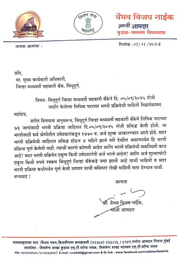 माजी आमदार वैभव नाईक यांनी सिंधुदुर्ग जिल्हा बँकेच्या मुख्य कार्यकारी अधिकारी यांना दिलेल्या पत्रात म्हटले आहे कि, सिंधुदुर्ग जिल्हा मध्यवर्ती सहकारी बँकेने लिपिक पदाच्या ७३ जागांसाठी भरती प्रक्रिया जाहिरात दि.०५/०९/२०२५ रोजी प्रसिद्ध केली होती. या भरतीसाठी सर्व श्रेणीतील उमेदवारांकडून १७७० रु. अर्ज शुल्क आकारण्यात आले होते. सदर भरती प्रक्रियेची जाहिरात प्रसिद्ध होऊन ४ महिने झाले तरी देखील अद्यापपर्यंत हि भरती प्रक्रिया पूर्ण केलेली नाही. त्याची कारणे कोणती आहेत आणि भरती प्रक्रियेची सद्यस्थिती काय आहे? सदर भरती प्रक्रियेत एकूण किती उमेदवारांनी अर्ज भरले आहेत? आणि अर्ज शुल्कापोटी एकूण किती रुपये रक्कम सिंधुदुर्ग जिल्हा बँकेकडे जमा झाली आहे याची माहिती व सदर भरती प्रक्रिया कधीपर्यंत पूर्ण केली जाणार याची सविस्तर लेखी माहिती मला देण्यात यावी असे त्यांनी पत्रात म्हटले आहे.