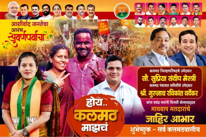 कलमठच्या सुजाण मतदारांनी विकासाला कौल देत कलमठ जिल्हा परिषद उमेदवार सौ. सुप्रिया संदीप मेस्त्री आणि कलमठ पंचायत समिती उमेदवार श्री. गुरुनाथ रविकांत वर्देकर यांना प्रचंड मतांनी विजयी केले.